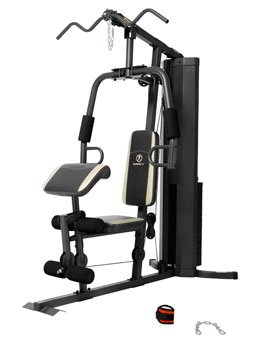 This Marcy Home Gym features Heavy duty, 14 gauge steel tube frame. 150 lb. vinyl coated weight stack. Dual function press arm performs check pressing and pec fly exercises. High and low pulley stations. Over sized foam roller pads add comfort while performing leg exercises. All cables are rated at 2,000 lb. tensile strength. Durable powder coat finish. Adjustable preacher curl bicep pad for isolated bicep exercises. Dimensions: 70"L x 36"W x 78"H. Weight Capacity: 600 lb. including user weight.